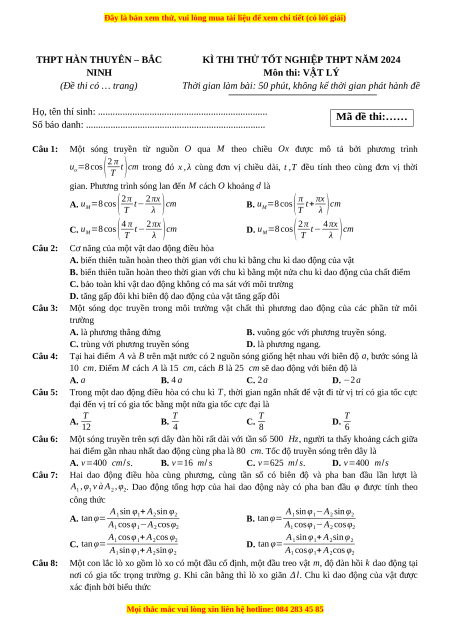 Đề thi thử tốt nghiệp Vật lí trường THPT Hàn Thuyên - Bắc Ninh lần 2 năm 2024
