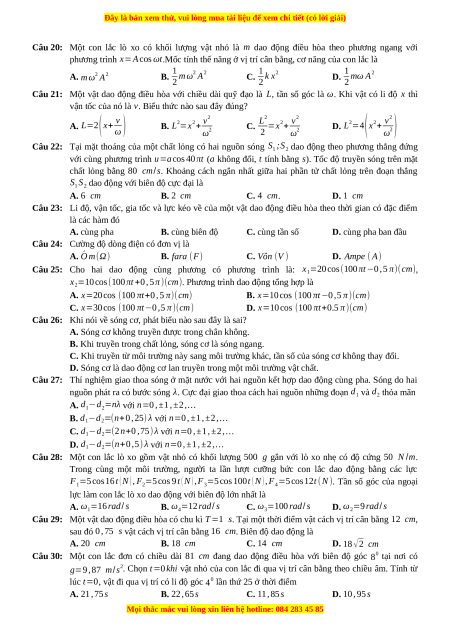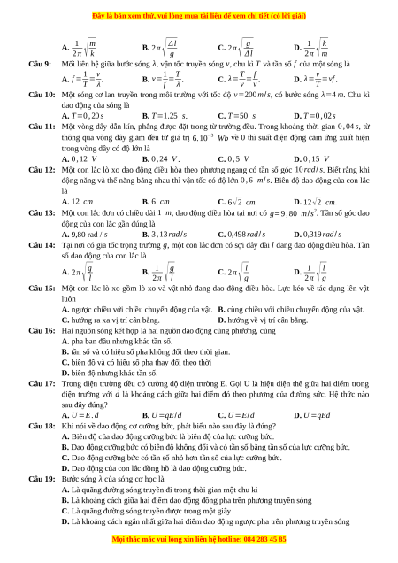 A. 1 B. 2 π C. 2 π D. 1 2 π √mk √Δlg √ gΔl 2 π √ km Câu 9:
