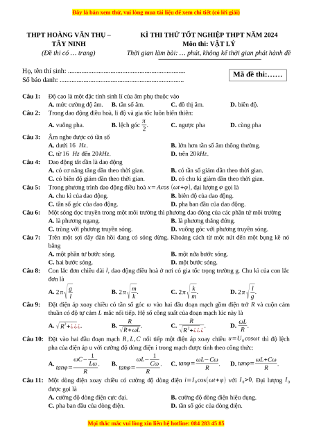 KÌ THI THỬ TỐT NGHIỆP THPT NĂM 2024 TÂY NINH Môn thi: VẬT LÝ