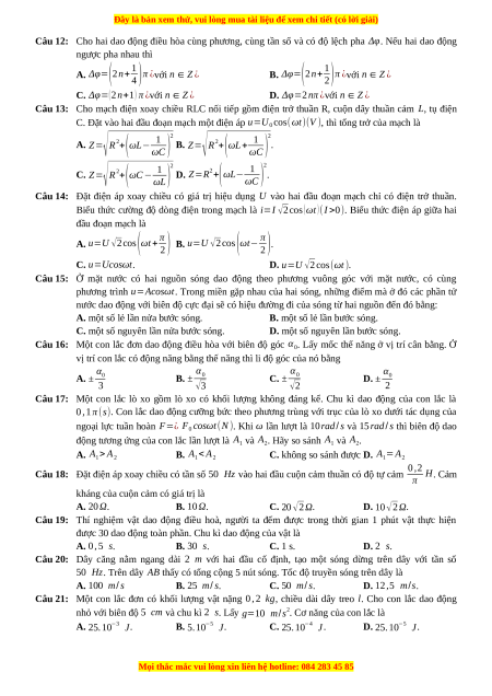 Câu 12: Cho hai dao động điều hòa cùng phương, cùng tần số và có độ lệch pha Δφ. Nếu hai dao động ngược pha nhau thì