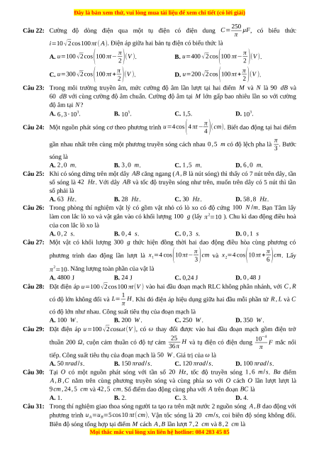 Câu 22: Cường độ dòng điện qua một tụ điện có điện dung C= 250 μF, có biểu thức π