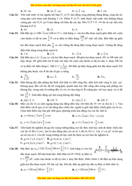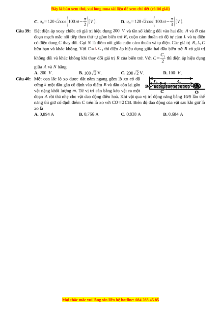 Câu 38: Đặt điện áp u =120 √2 cos AB