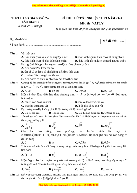 Đề thi thử tốt nghiệp Vật lí trường THPT Lạng Giang số 2 - Bắc Giang năm 2024
