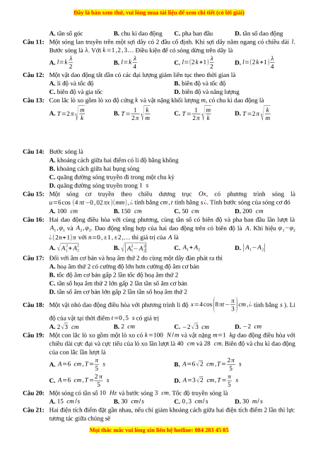 Câu 11: Một sóng lan truyền trên một sợi dây có 2 đầu cố định. Khi sợi dây nằm ngang có chiều dài l.