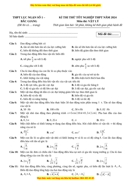 KÌ THI THỬ TỐT NGHIỆP THPT NĂM 2024 BẮC GIANG Môn thi: VẬT LÝ