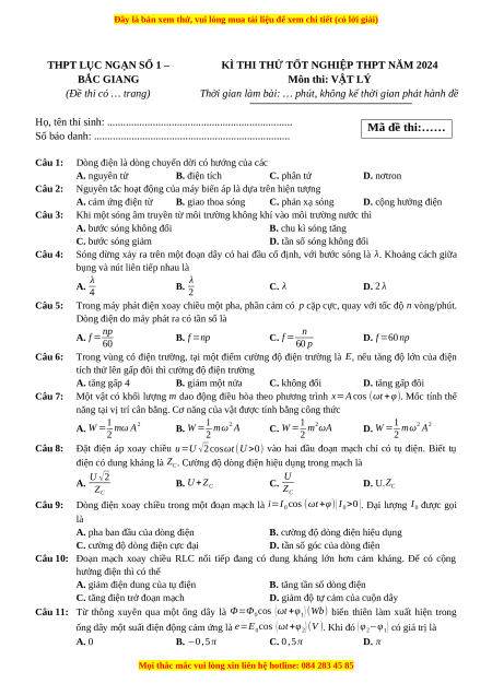 KÌ THI THỬ TỐT NGHIỆP THPT NĂM 2024 BẮC GIANG Môn thi: VẬT LÝ