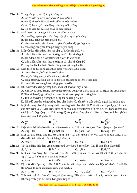 Câu 13: Bước sóng là khoảng cách giữa hai phần tử sóng
