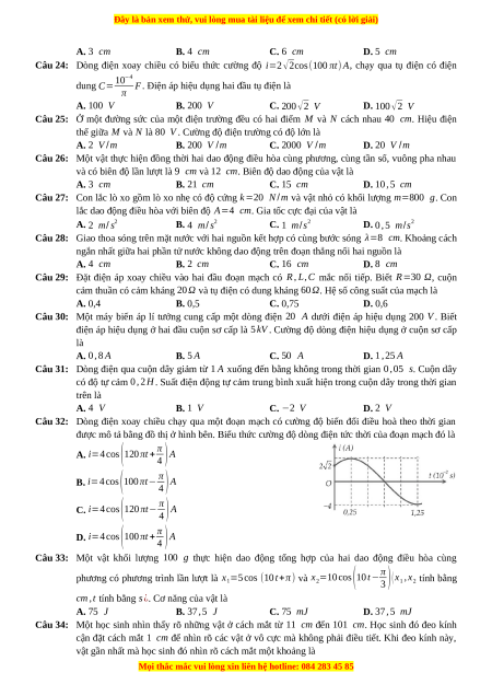 Câu 32: Dòng điện xoay chiều chạy qua một đoạn mạch có cường độ biến đổi điều hoà theo thời gian