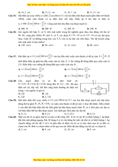 Câu 35: Đặt điện áp xoay chiều u=200 √2cos100 πt(V ) vào hai đầu một đoạn mạch gồm điện trở thuần