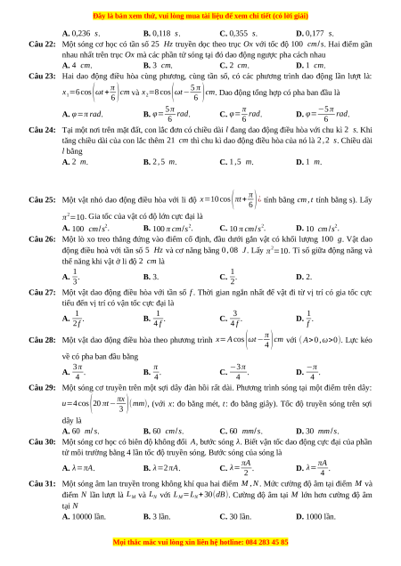 Câu 22: Một sóng cơ học có tần số 25 Hz truyền dọc theo trục Ox với tốc độ 100 cm/s. Hai điểm gần