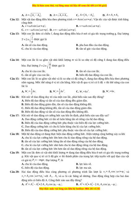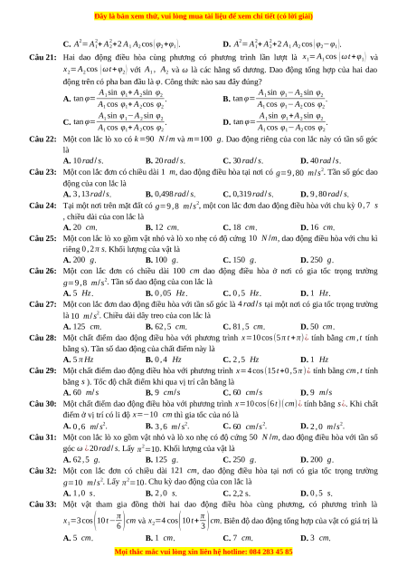 Câu 20: Hai dao động điều hòa cùng phương có phương trình lần lượt là x = A cos 1 1 (ωt+φ1) và