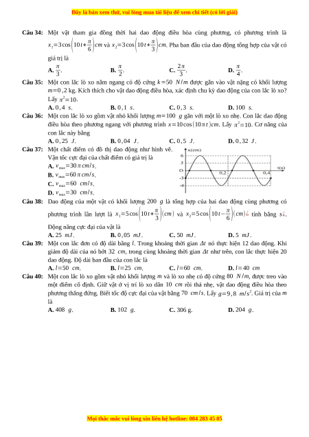 Câu 38: Dao động của một vật có khối lượng 200 g là tổng hợp của hai dao động cùng phương có