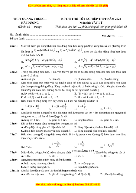 KÌ THI THỬ TỐT NGHIỆP THPT NĂM 2024 HẢI DƯƠNG Môn thi: VẬT LÝ