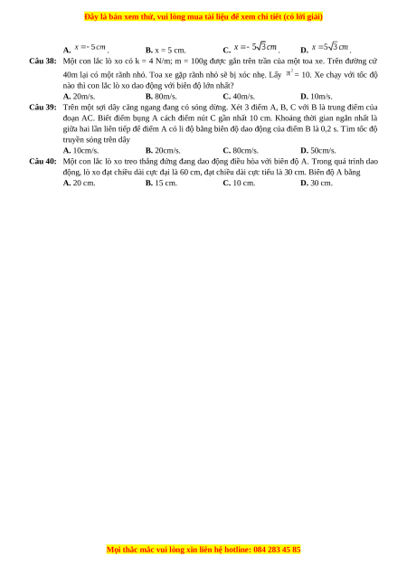 Câu 37: Một vật dao động điều hòa với phương trình . Khi pha dao động là