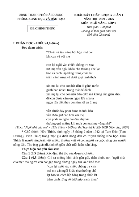 Đề thi thử vào 10 Ngữ Văn năm 2025 Phòng GD&ĐT TP Hải Dương (Lần 1)