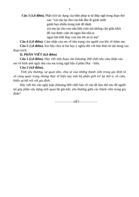em về hình ảnh ngôi nhà của mẹ trong ngữ liệu ở phần Đọc - hiểu. Câu 2 (4,0 điểm).