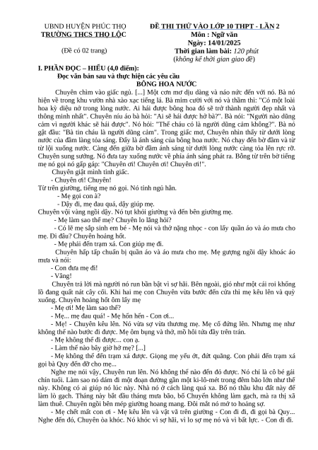 UBND HUYỆN PHÚC THỌ ĐỀ THI THỬ VÀO LỚP 10 THPT - LẦN 2 TRƯỜNG THCS THỌ L Ộ C Môn : Ngữ văn Ngày: 14/01/2025 (Đề có 02 trang)