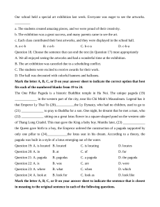 Question 19: A. is located B. located C. is locating D. locates Question 20: A. in B. at C. of D. for Question 21: A. pagoda B. pagodas C. a pagoda D. the pagoda Question 22: A. is B. was C. are D. were Question 23: A. where B. what C. when D. which Question 24: A. look at B. look for C. look as D. look like