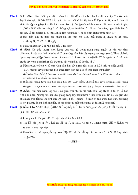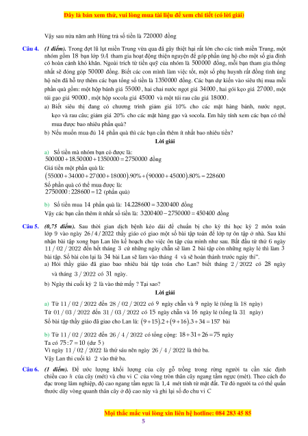 Câu 5. (0,75 điểm). Sau thời gian dịch bệnh kéo dài để chuẩn bị cho kỳ thi học kỳ 2 môn toán