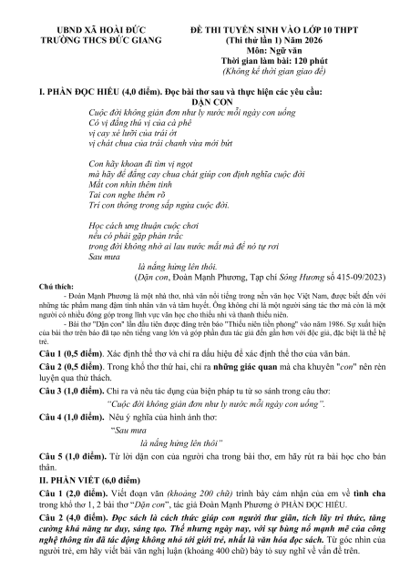 (Thi thử lần 1) Năm 2026 Môn: Ngữ văn