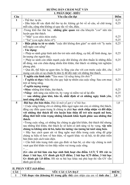 I. PHẦN ĐỌC- HIỂU Câu Yêu cầu cần đạt Điểm 1 - Thể thơ: tự do. 0,25