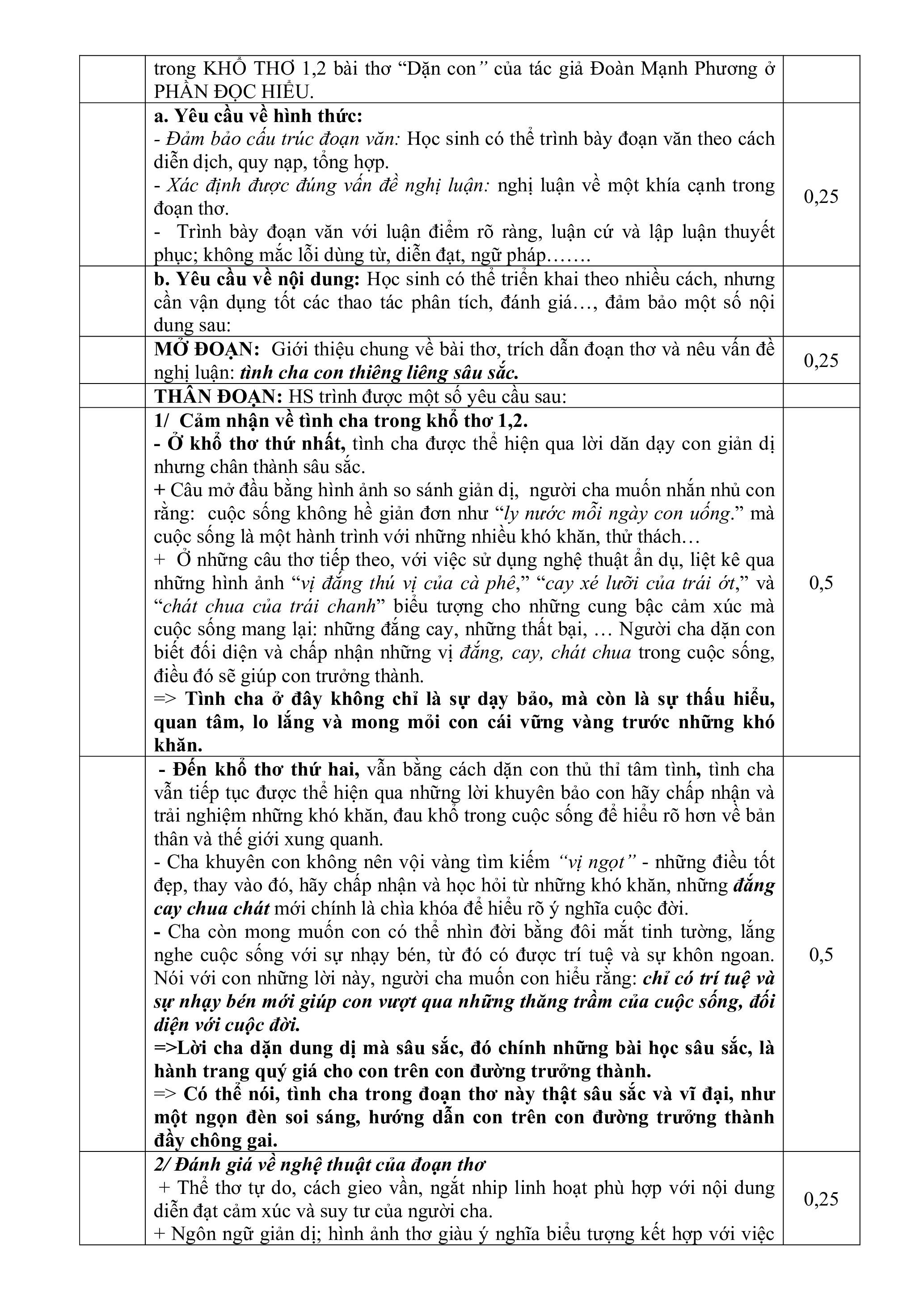 - Xác định được đúng vấn đề nghị luận: nghị luận về một khía cạnh trong đoạn thơ. 0,25