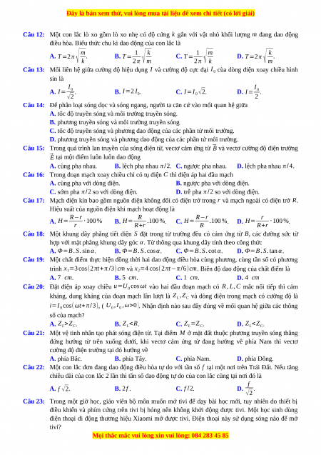 Một chất điểm đang thực hiện dao động tắt dần. Đại lượng nào sau đây giảm dần theo thời gian? A. Li độ. B. Biên độ. C. Vận tốc. D. Gia tốc. Câu 7: