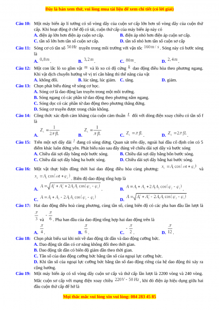Câu 10: Một máy biến áp lí tưởng có số vòng dây của cuộn sơ cấp lớn hơn số vòng dây của cuộn thứ