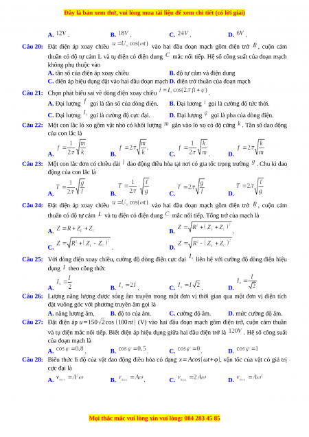 Câu 14: Công thức xác định cảm kháng của cuộn cảm thuần đối với dòng điện xoay chiều có tần số f là A. B. C. . D. .