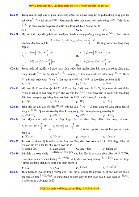 Câu 29: Trong một thí nghiệm về giao thoa sóng nước, hai nguồn sóng kết hợp dao động cùng pha tại hai điểm cách nhau