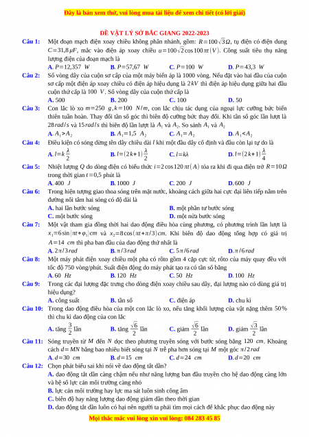 ĐỀ VẬT LÝ SỞ BẮC GIANG 2022-2023 Câu 1: