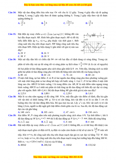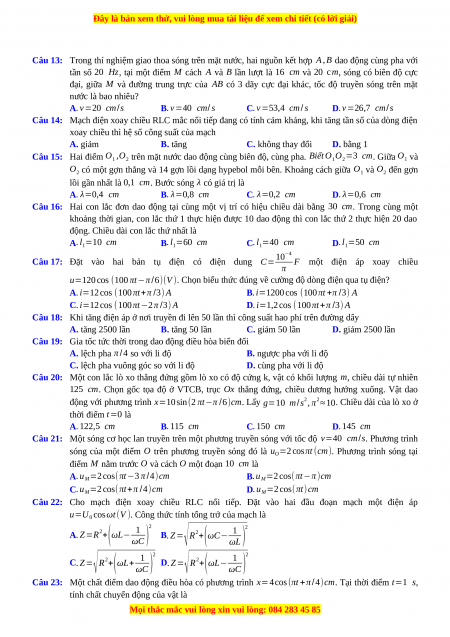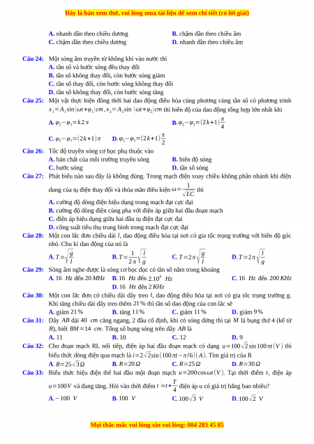 Câu 21: Một sóng cơ học lan truyền trên một phương truyền sóng với tốc độ v=40 cm/s. Phương trình