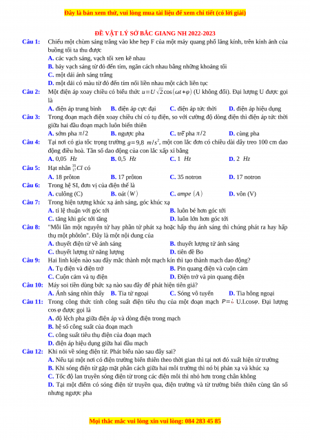 ĐỀ VẬT LÝ SỞ BẮC GIANG NH 2022-2023 Câu 1: