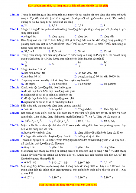 Câu 25: Một sóng điện từ lan truyền trong chân không có bước sóng 6000 m. Lấy c = 3.108 m/s. Biết