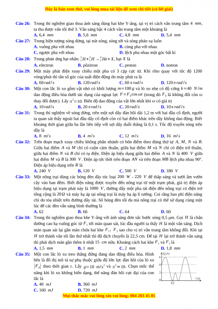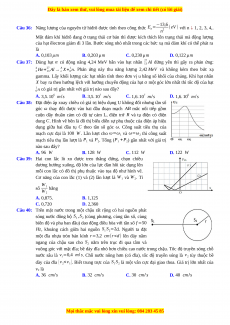 động điều hoà. Tần số dao động của con lắc xấp xỉ bằng A. 0,05 Hz B. 0,5 Hz C. 1 Hz D. 2 Hz Câu 5: Hạt nhân 35 17 Cl có A. 18 prôton B. 17 prôton C. 35 notron D. 17 notron Câu 6: