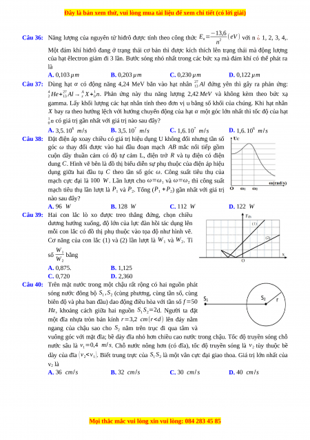 Câu 27: Trong hiện tượng sóng dừng, tại nút sóng, sóng tới và sóng phản xạ luôn
