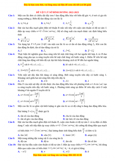 ĐỀ VẬT LÝ SỞ BÌNH DƯƠNG 2022-2023 Câu 1: