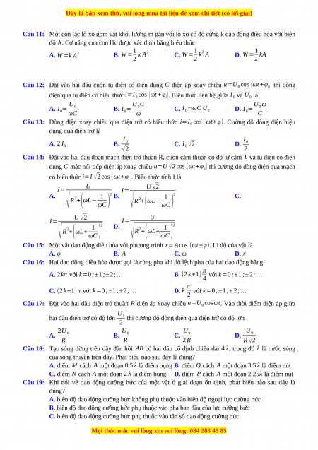 Câu 12: Đặt vào hai đầu cuộn tụ điện có điện dung C điện áp xoay chiều u=U cos 0
