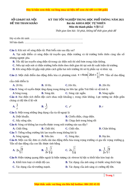 Đây là bản xem th , vu ử i lòng mua tài li u ệ đ xe ể m chi ti t ế (có l i ờ gi i ả ) SỞ GD&ĐT HÀ N I Ộ KỲ THI TỐT NGHI P Ệ TRUNG H C Ọ PH Ổ THÔNG NĂM 2021 Đ Ề THI THAM KH O Ả