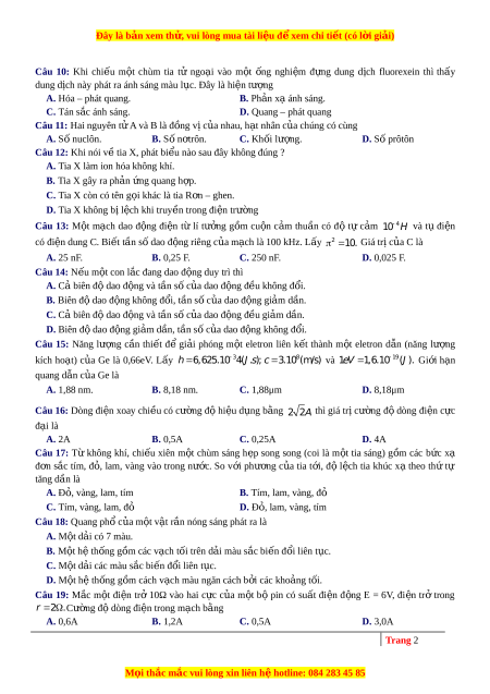 Đây là bản xem th , vu ử i lòng mua tài li u ệ đ xe ể m chi ti t ế (có l i ờ gi i ả ) Câu 10: Khi chi u ế m t ộ chùm tia tử ngo i ạ vào m t ộ ng ố nghi m ệ đ ng ự dung d c ị h fluorexein thì thấy dung d c