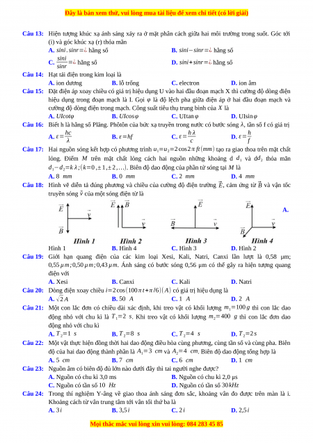 Câu 19: Giới hạn quang điện của các kim loại Xesi, Kali, Natri, Canxi lần lượt là 0,58 μm;