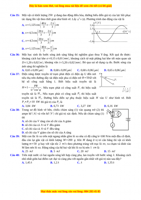Câu 17: Hai nguồn sóng kết hợp có phương trình u1=u2=2 cos2 π ft (mm) tạo ra giao thoa trên mặt chất