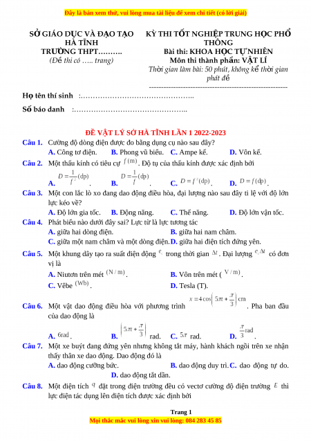 ĐỀ VẬT LÝ SỞ HÀ TĨNH LẦN 1 2022-2023