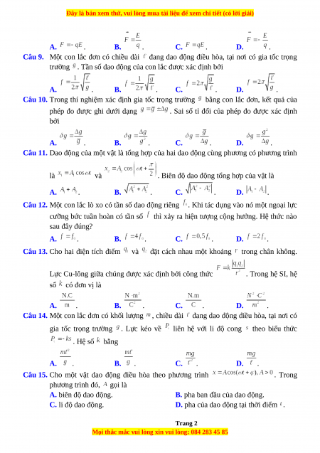 Câu 9. Một con lắc đơn có chiều dài đang dao động điều hòa, tại nơi có gia tốc trọng