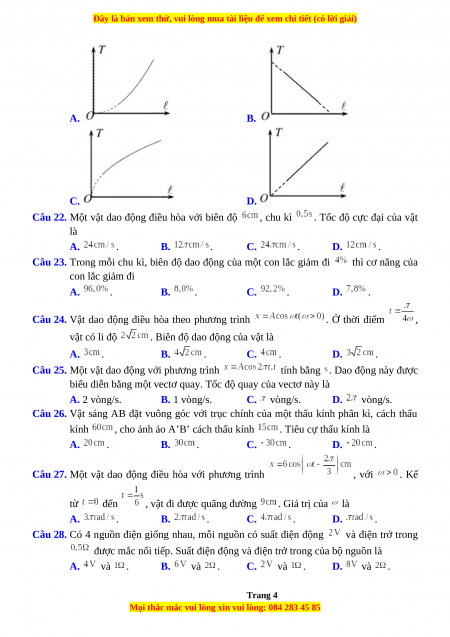 Câu 22. Một vật dao động điều hòa với biên độ , chu kì . Tốc độ cực đại của vật