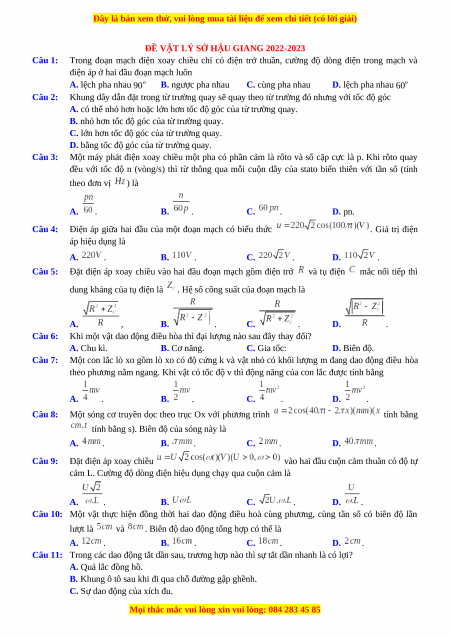 ĐỀ VẬT LÝ SỞ HẬU GIANG 2022-2023 Câu 1: