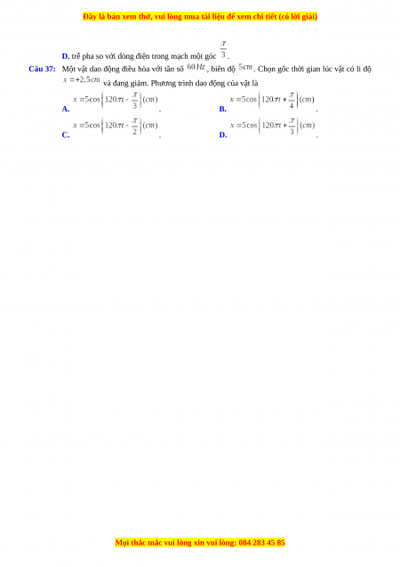 Câu 37: Một vật dao động điều hòa với tần số , biên độ . Chọn gốc thời gian lúc vật có li độ