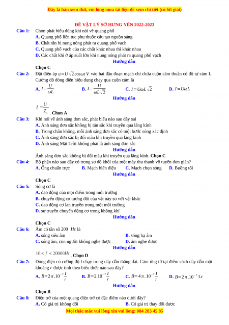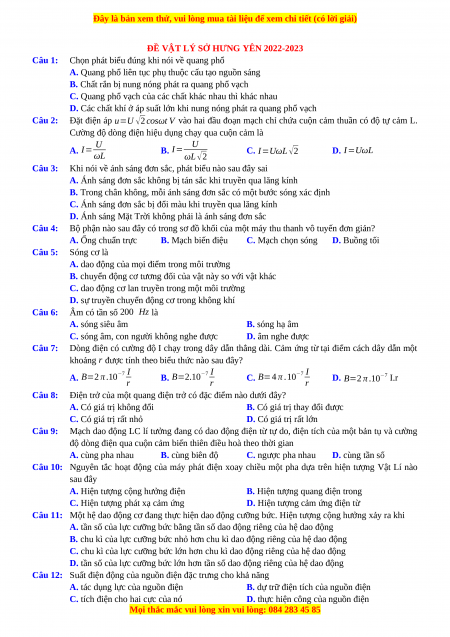 ĐỀ VẬT LÝ SỞ HƯNG YÊN 2022-2023 Câu 1: