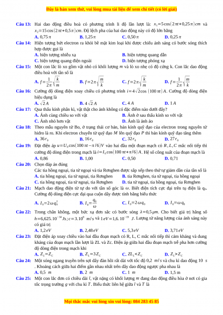 Câu 13: Hai dao động điều hoà có phương trình li độ lần lượt là: x1=5 cos(2 πt+0,25 π )cm và