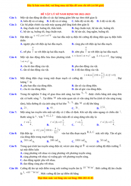 ĐỀ VẬT LÝ SỞ NAM ĐỊNH NH 2022-2023 Câu 1: